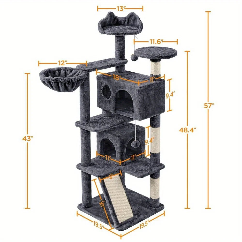 This multi-tier 57'' tall cat tree tower can keep your kittens from scratching your delicate furniture and provides them with a space to have fun and nap. It is constructed of safe and sturdy particleboard with pet-friendly soft, plush fabric covering. The natural sisal rope covered posts, hanging fur balls, comfortable perches, fluffy condos are fit for your kittens to climb, scratch, play and lounge.