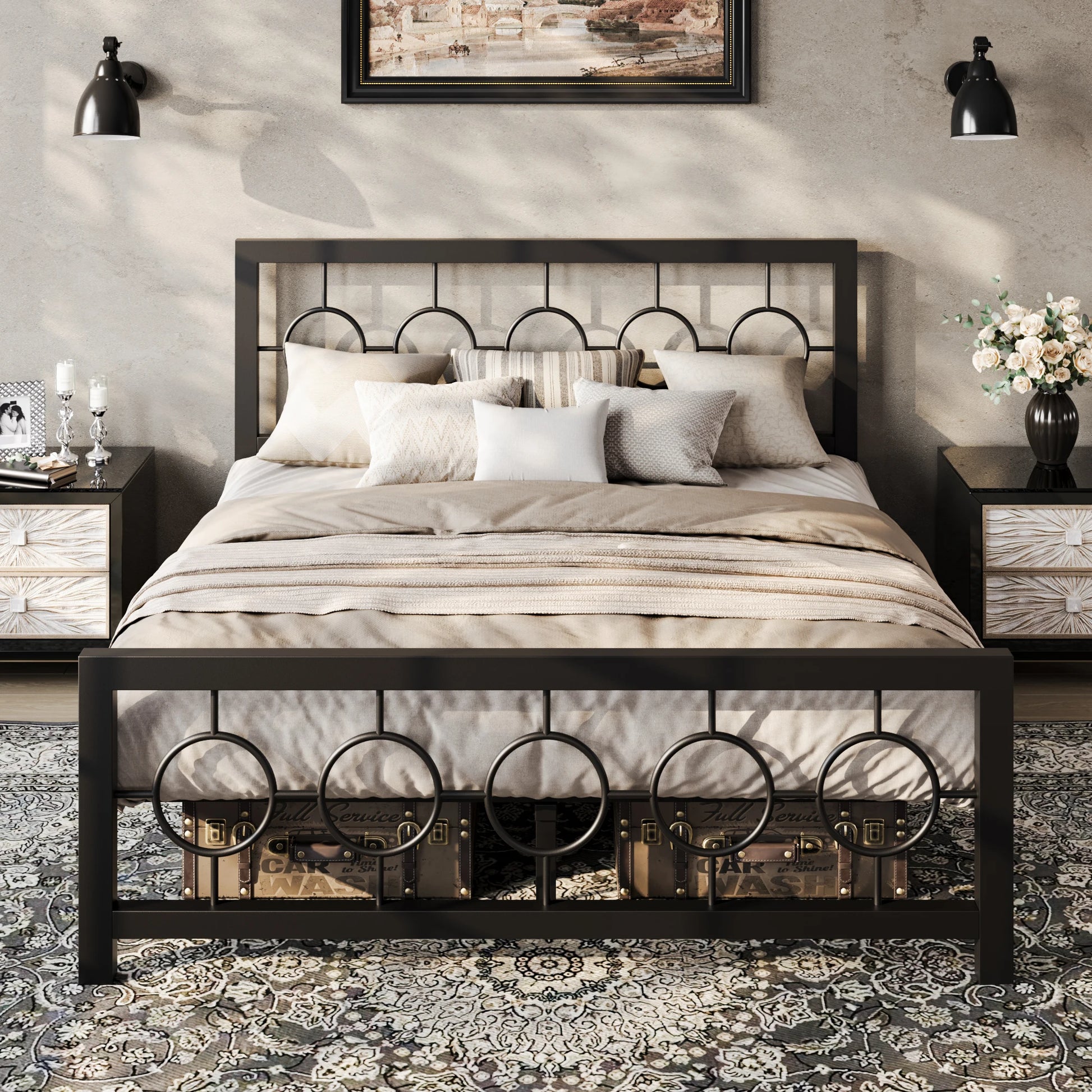 Metal Platform Bed Frame with Vintage Circular Design Headboard and Footboard